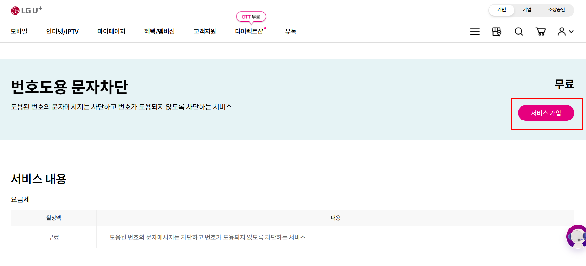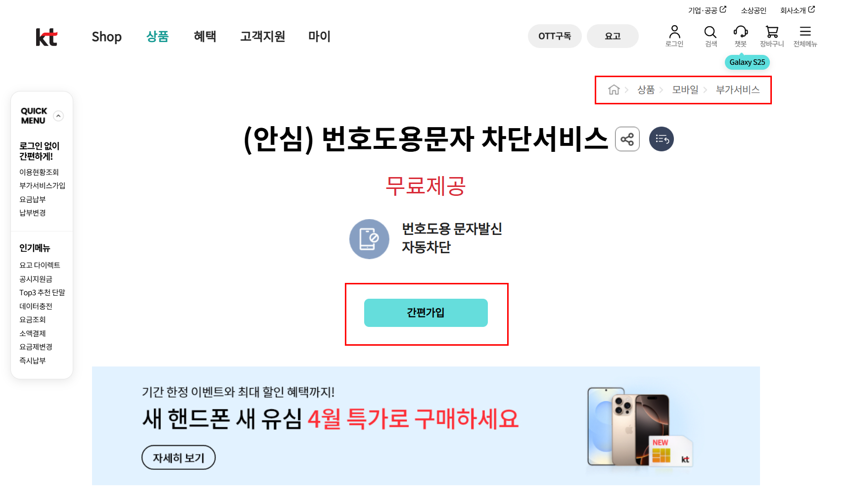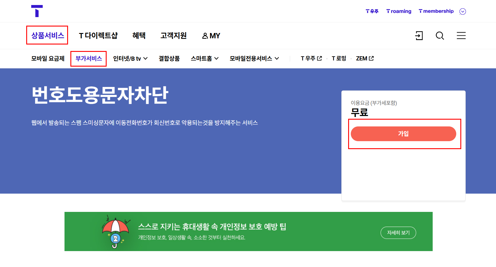 - KT 홈페이지 또는 앱에서 로그인 후, 부가서비스 > 안심 > (안심) 번호도용 문자차단 서비스 메뉴에서 신청
