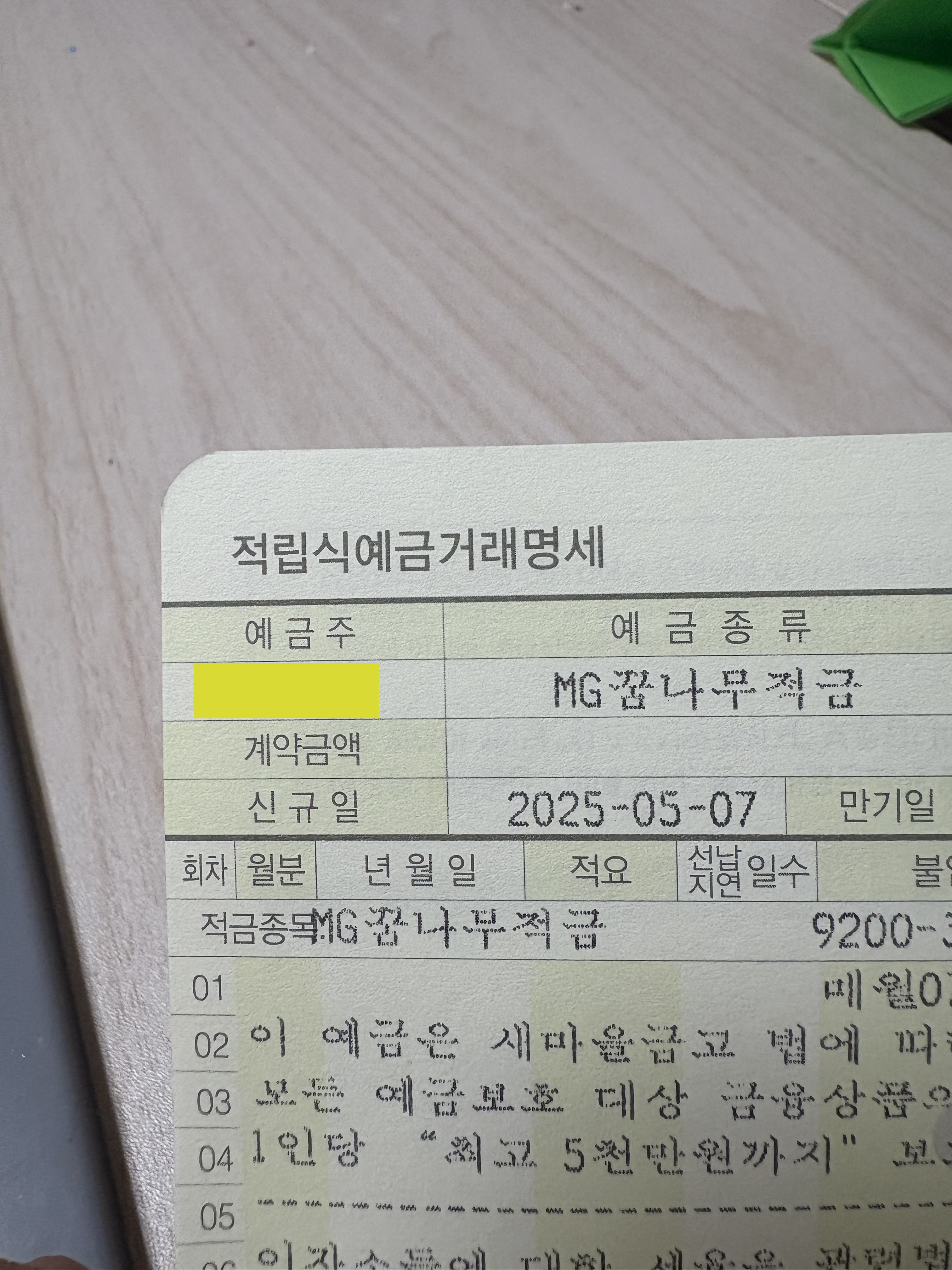 저는 5월 7일에 MG꿈나무적금에 가입했습니다. 이미 자녀 명의의 입출금 통장이 있었기 때문에, 자동이체만 설정하여 간편하게 우대 이율 조건을 충족했어요. 기본 이율이 최대 3.9%라고 하는데 저희 동네는 아쉽게도 3.4%였습니다. 그래서 최종 이율은 9.4%. 그래도 평균보단 높은 이율이기에 만족합니다. 실제 가입 기간이 제가 가입한 지점은 5월 7일(수)까지였는데, 선착순 10,000계좌여서 그런 것은 아닌가 추측해봅니다. 실제 대기 시간은 30분 정도 되었고, 전산상의 문제인지 가입하는데 20~30분 정도 걸렸습니다.