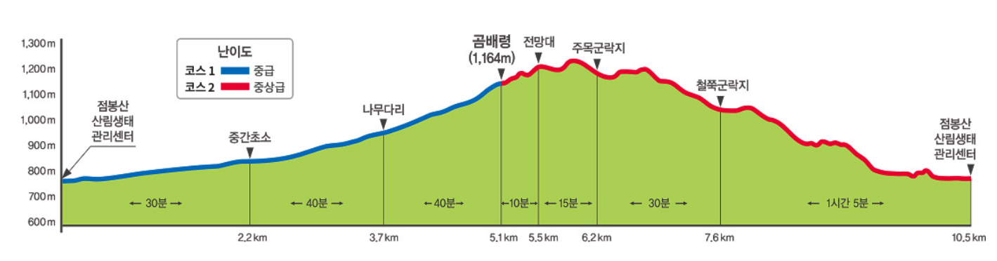 곰배령 탐방로는 총 10.5km로 구성되어 있으며, 코스1(중급)과 코스2(중상급)로 나뉩니다.