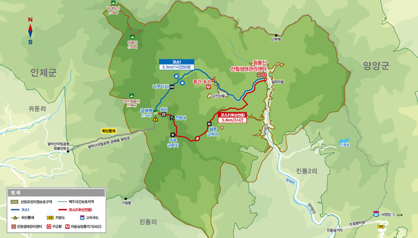 - 탐방 종료 시간: 곰배령 정상부 - 코스1: 14시, 코스2: 13시 30분 / 점봉산산림생태관리센터 - 16시