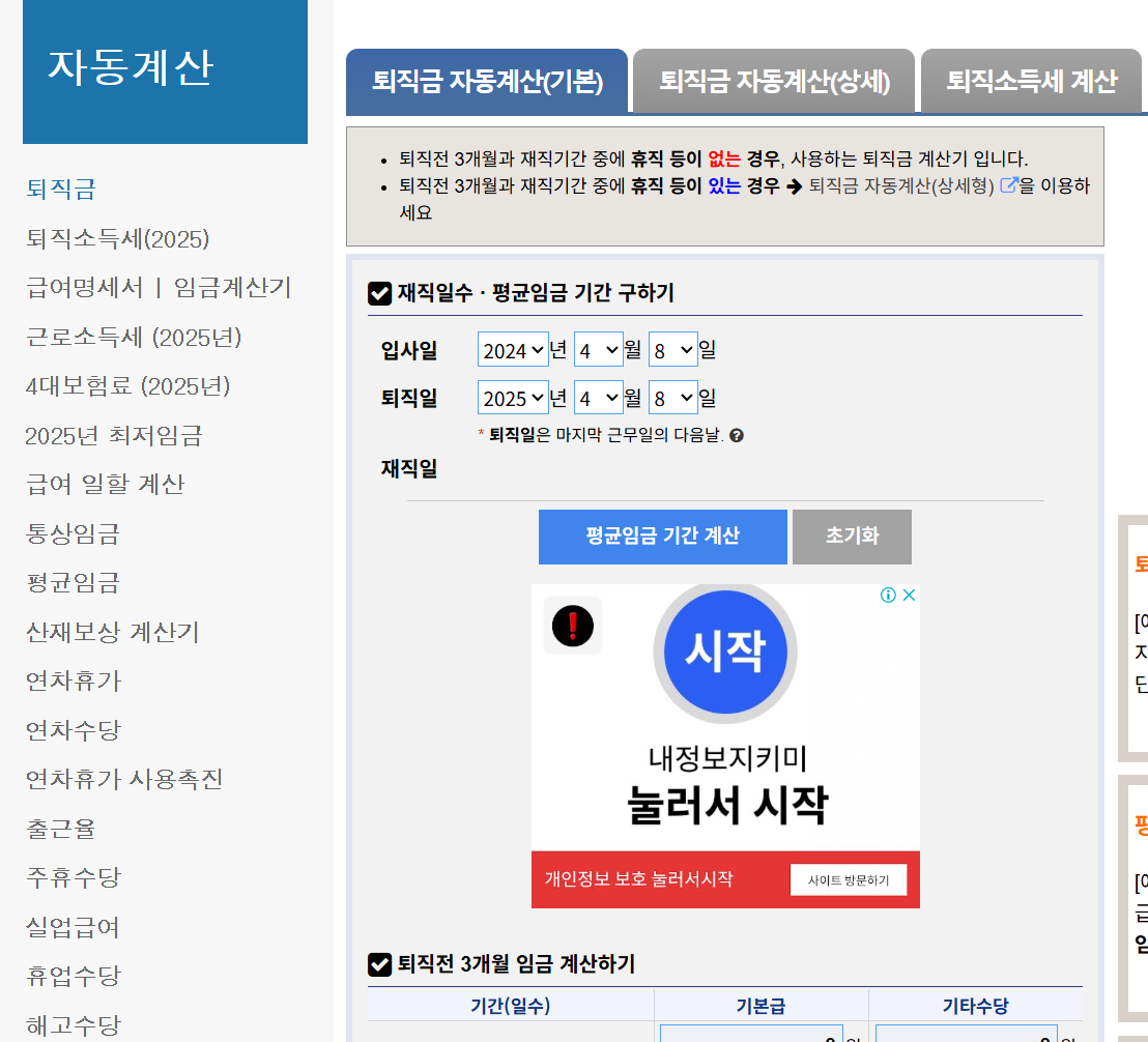 - 고용노동부 계산기 → 퇴직금 정확히 계산