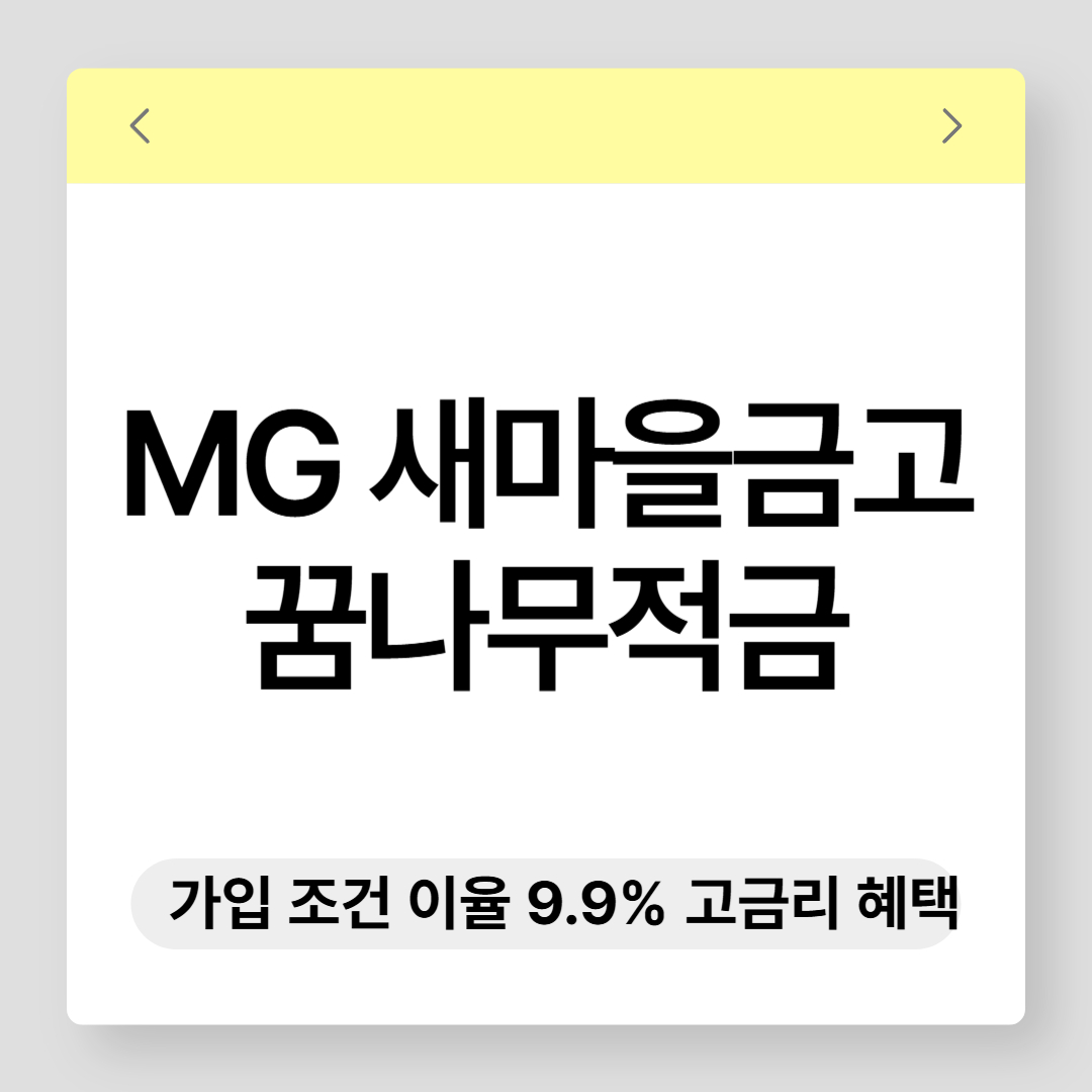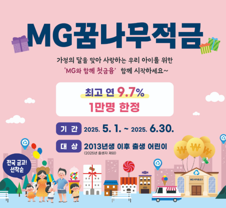 2025년 5월, 새마을금고에서 만 12세 이하 어린이를 위한 특별한 적금 상품인 MG꿈나무적금을 출시했습니다. 최고 연 9%의 금리를 제공하는 이 상품은 자녀의 첫 금융 경험을 위한 최적의 선택입니다.